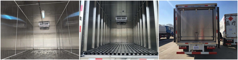廂體配置: 廂體采用聚酯濕法制板工藝和玻璃纖維加強全木廂體框架結構,全封閉聚氨酯板塊粘接法;保溫性能達到國家A級標準。 廂板材質:內外壁板選用國內優質的2.5mm納米玻璃鋼(不吸光、隔熱性好、硬度強、抗氧化);中間保溫材料為無空隙填充進口聚氨酯發泡;廂體厚度80mm,門厚度80mm;廂體底部為鋁合金花紋板或選平面納米玻璃鋼; 配件:廂體周邊鋁合金包邊,不銹鋼包角,不銹鋼門鎖,防碰膠皮4塊,不銹鋼門框, 不銹鋼合頁,箱內節能照明燈; 廂體厚度可選100mm、120mm,內外壁板可選裝玻璃鋼、彩鋼板、不銹鋼、鋁合金。