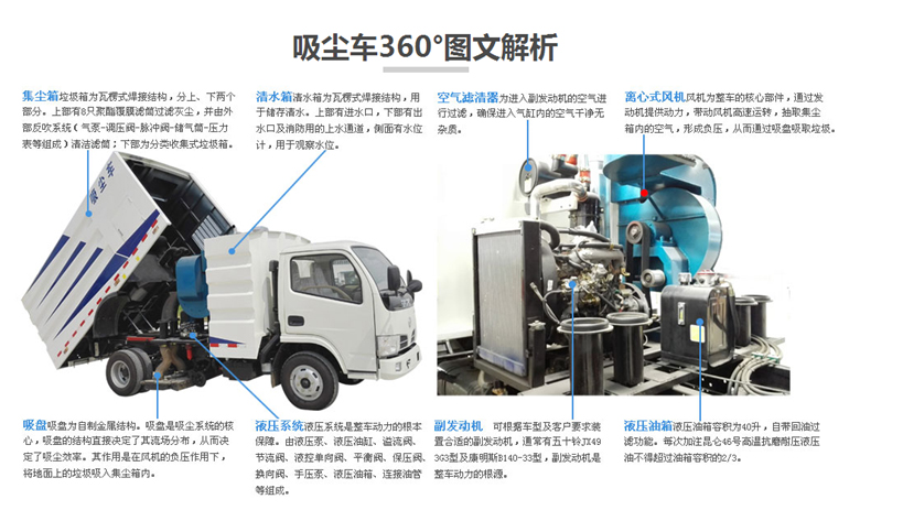 五十鈴吸塵車采用不銹鋼方形廂體,獨立垃圾箱,后傾翻機構(gòu),液壓升降,操縱機構(gòu),(手動+電動)集中式控制面板,車廂與后門密封,液壓自動鎖緊,無泄露。副發(fā)動機采用五十鈴78馬力發(fā)動機。