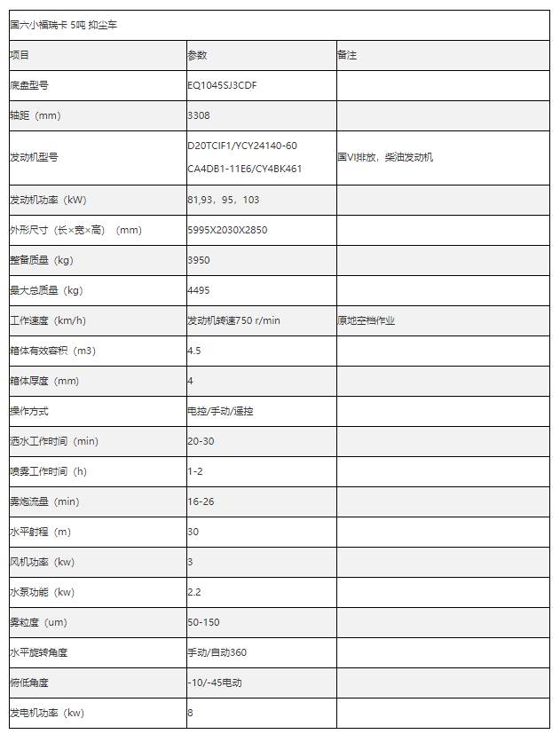 國六小福瑞卡 5噸 抑塵車規格型號/配置/參數